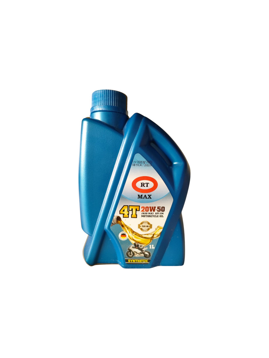 RT MAX 4T 20W-50 est une huile moteur synthétique haute performance spécialement conçue pour les moteurs 4 temps de motos et scooters. Formulée selon les normes JASO MA2 et API SN, elle garantit une excellente lubrification, une protection maximale du moteur et un fonctionnement fluide, même en conditions extrêmes.